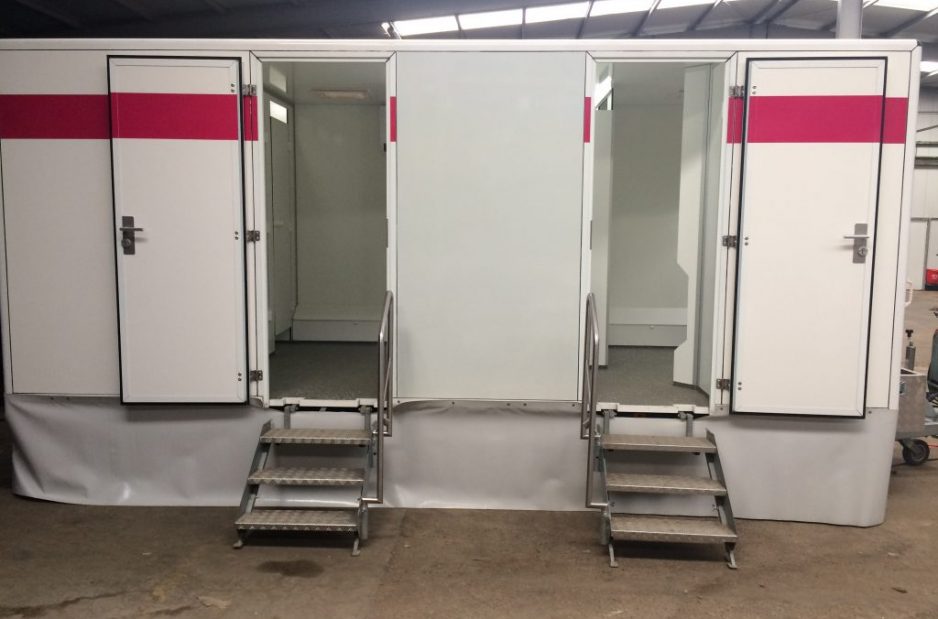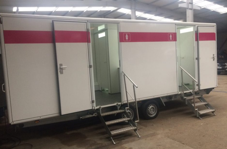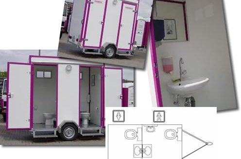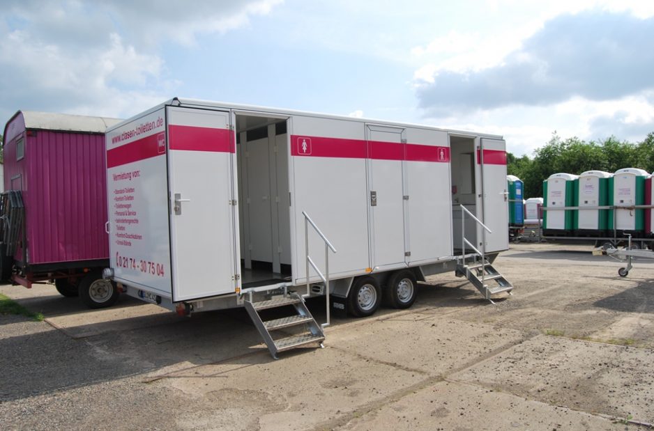 Mit einer Fläche von rund 15m² zählt dieser Toilettenwagen wie auch Wagen Nr.7 zu den Wagen für mittlere bis größere Veranstaltungen. Mit insgesamt vier Toiletten und drei Urinalen ist auch in Stoßzeiten für ausreichend Platz gesorgt.