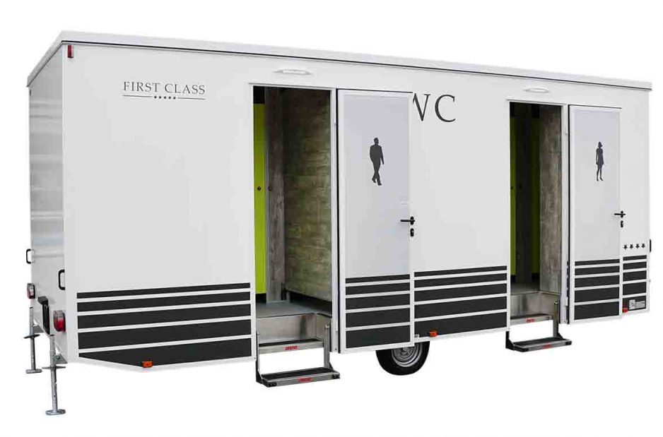 Mit einer Fläche von rund 15m² zählt dieser Toilettenwagen wie auch Wagen Nr.7 zu den Wagen für mittlere bis größere Veranstaltungen. Mit insgesamt vier Toiletten und drei Urinalen ist auch in Stoßzeiten für ausreichend Platz gesorgt.